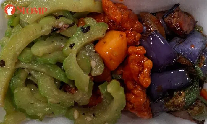 "At this food court, three items without rice - sweet sour pork, brinjal and bitter gourd - cost only $3.69.