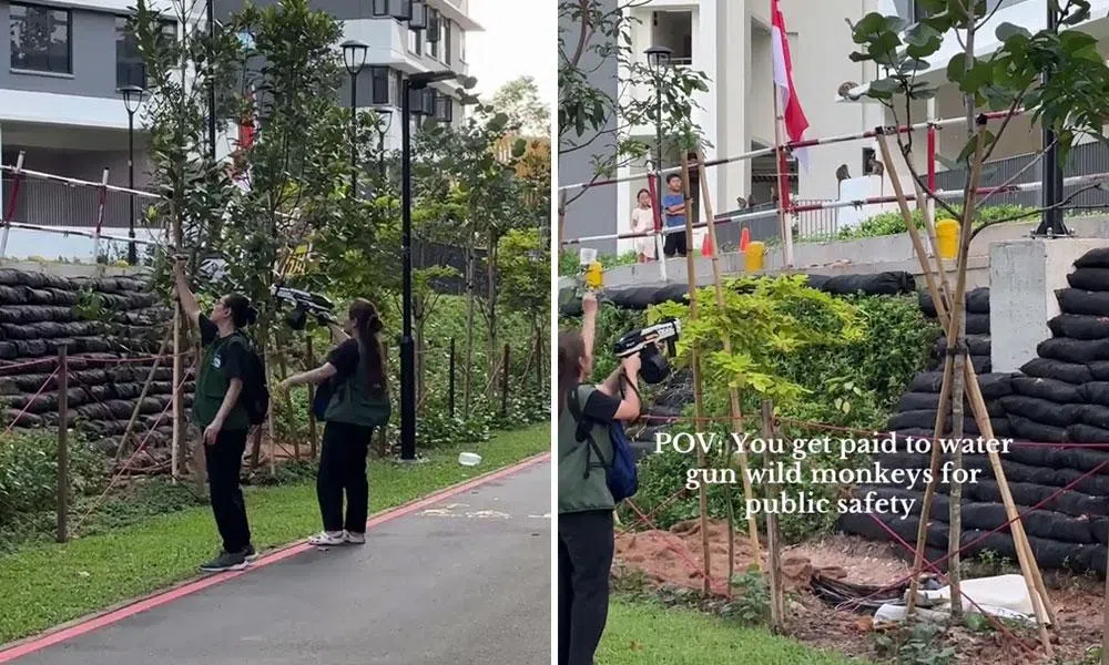 In a TikTok video posted on Aug 3 by user @coconoteee, the officers are seen patrolling an HDB block in Punggol Coast, aiming toy-like rifles at the macaques.