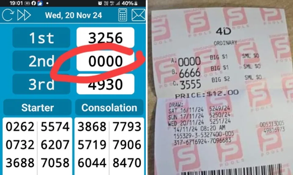 In response, two people posted in the comments photos of a 4D betting slip for the Nov 20 draw that had 0000 as one of the numbers.