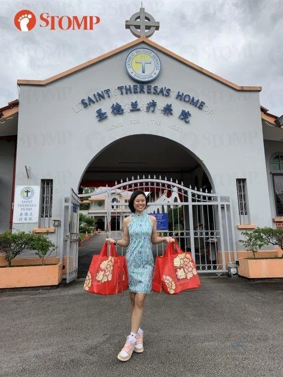 Her mother, Stomper Audrey, shared that on Jan 29, the first day of Chinese New Year, Miss Yap delivered festive goodies such as pineapple tarts, love letters and almond cookies to the elderly residents of St Theresa’s Home at Upper Thomson Road.