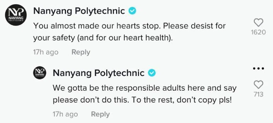 NYP's official TikTok account commented on the video urging their students not to do this stunt.