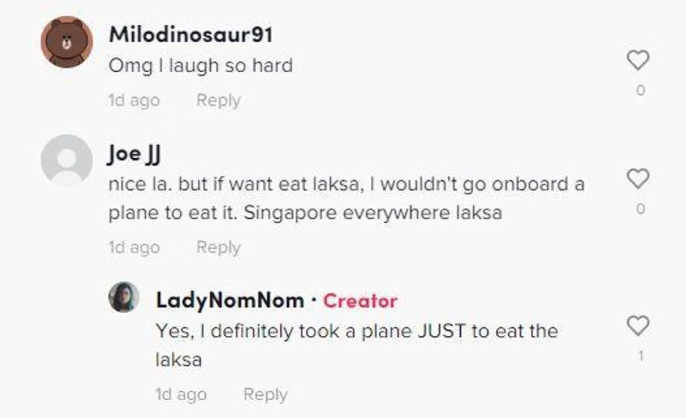 While the TikTok video made a few netizens suddenly crave laksa, others were entertained by LadyNomNom's reaction to the food. Even Changi Airport chimed in.