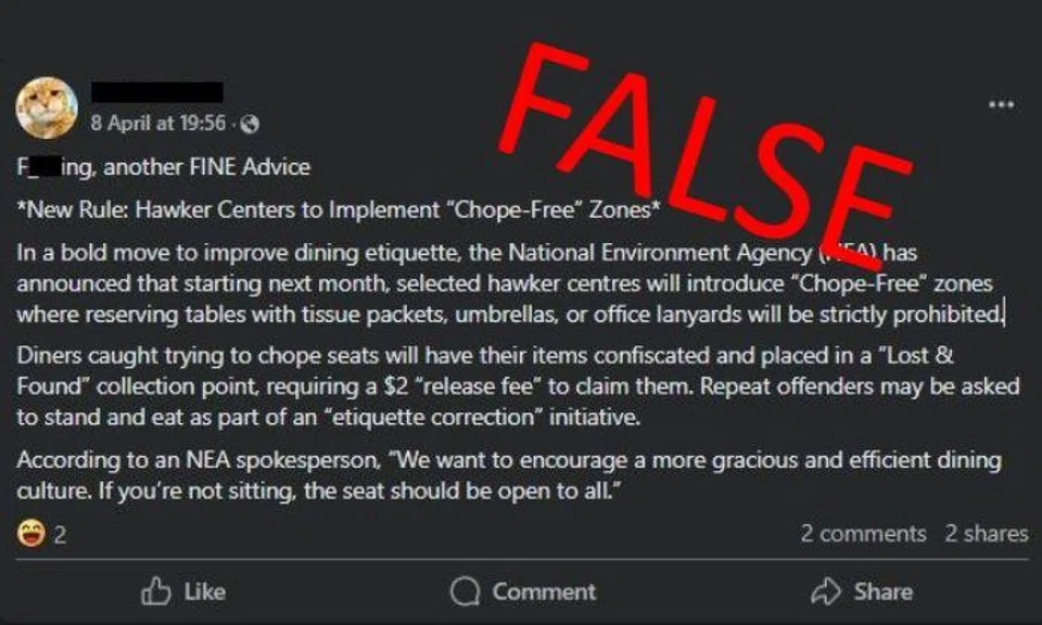 One such Facebook post seen by The Straits Times claims that NEA will be introducing these zones at selected hawker centres, which will see diners caught trying to "chope" seats with tissue packets, umbrellas or office lanyards having their items confiscated.
