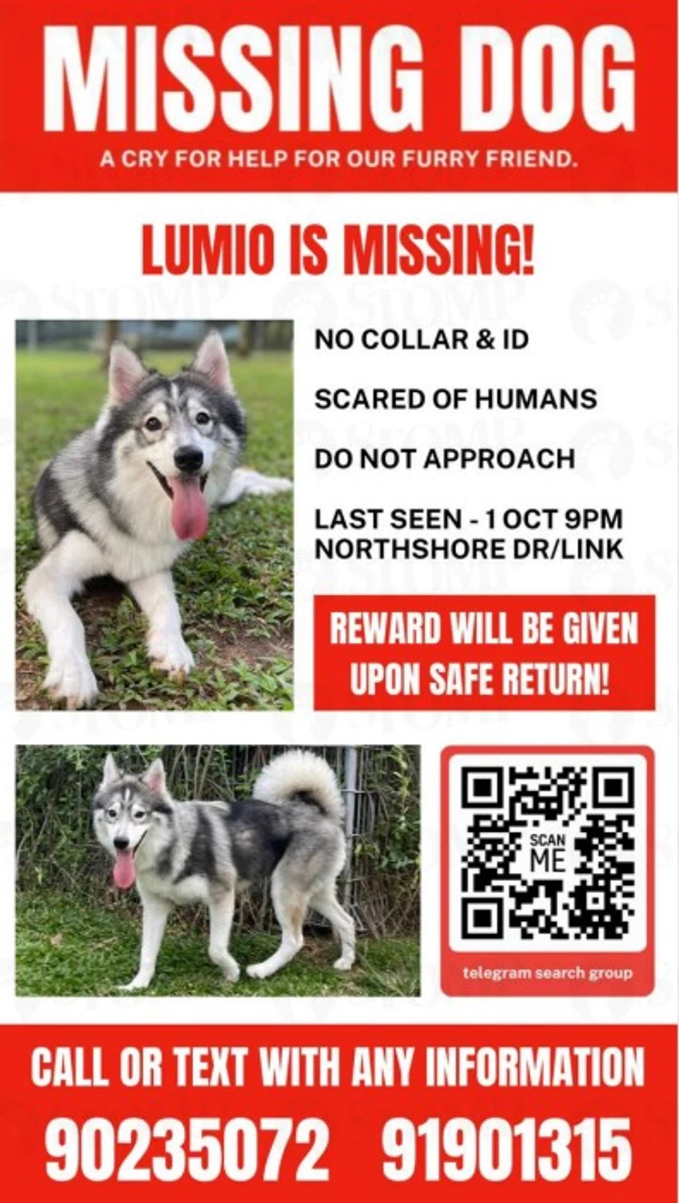 Lumio, a seven-month-old pomsky, has been missing since Oct 1, last seen at 9pm at Northshore Link.