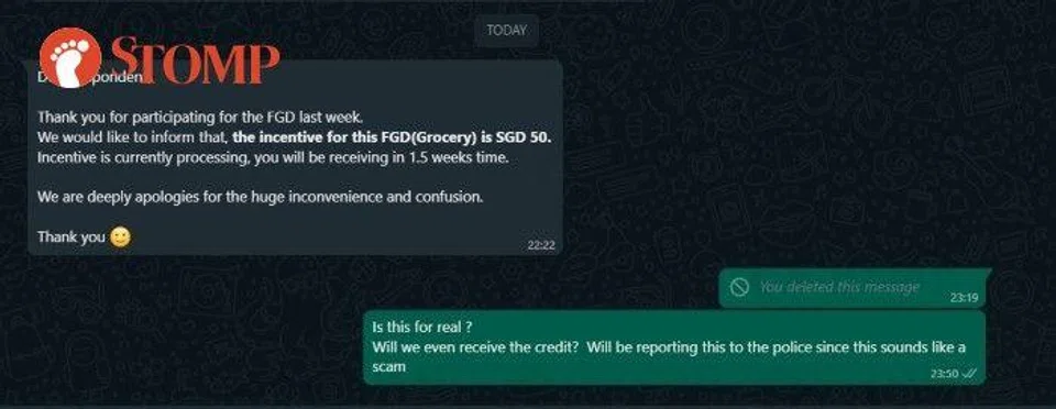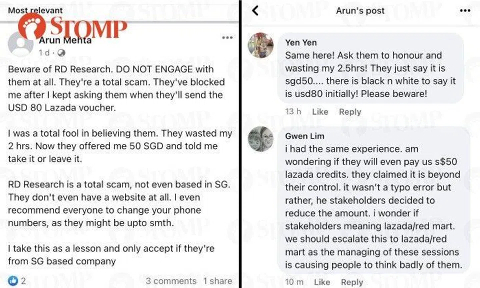 The Stomper said: "I am afraid that more Singaporeans may get cheated by a company in this Facebook group which allows survey groups to post 'surveys' by promising payments after doing surveys and taste tests, etc.