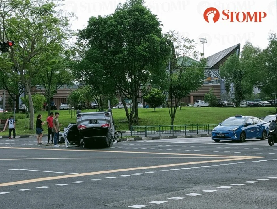 Overturned Honda at Serangoon junction believed to have skidded, knocked down traffic light pole
