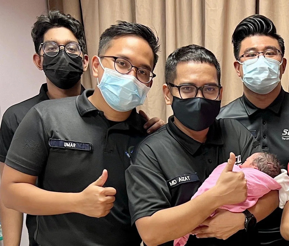From left: CPL (NS) Muhamad Affiq Malik, SGT3 Umar Mohamed Sobri Bin Mohammad Khair, SGT3 Muhammad Aizat Bin Mohamad Salim and WO1 Muhammad Husnul Bin Halim with the baby after the safe delivery. Photo: Singapore Civil Defence Force