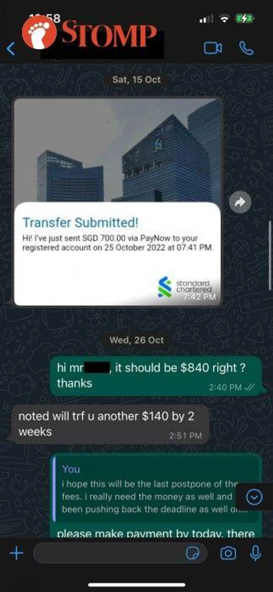 "At this time, I already told him nicely that this shall be the nice postponement and on Oct 26 he did make a payment but only transferred me $700.