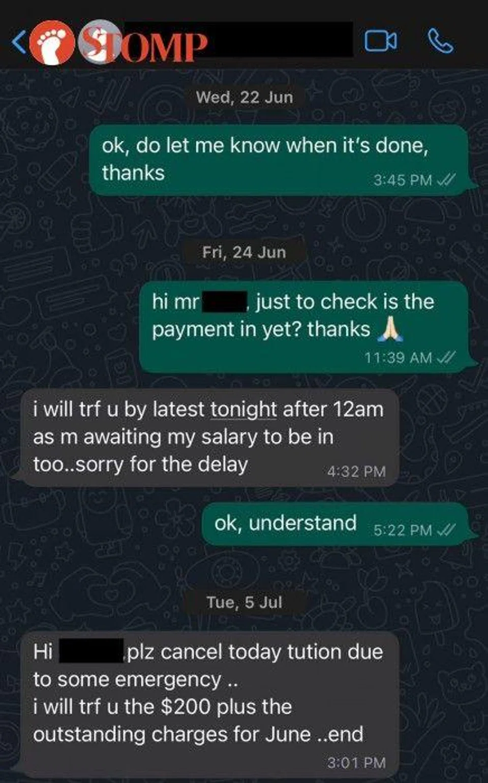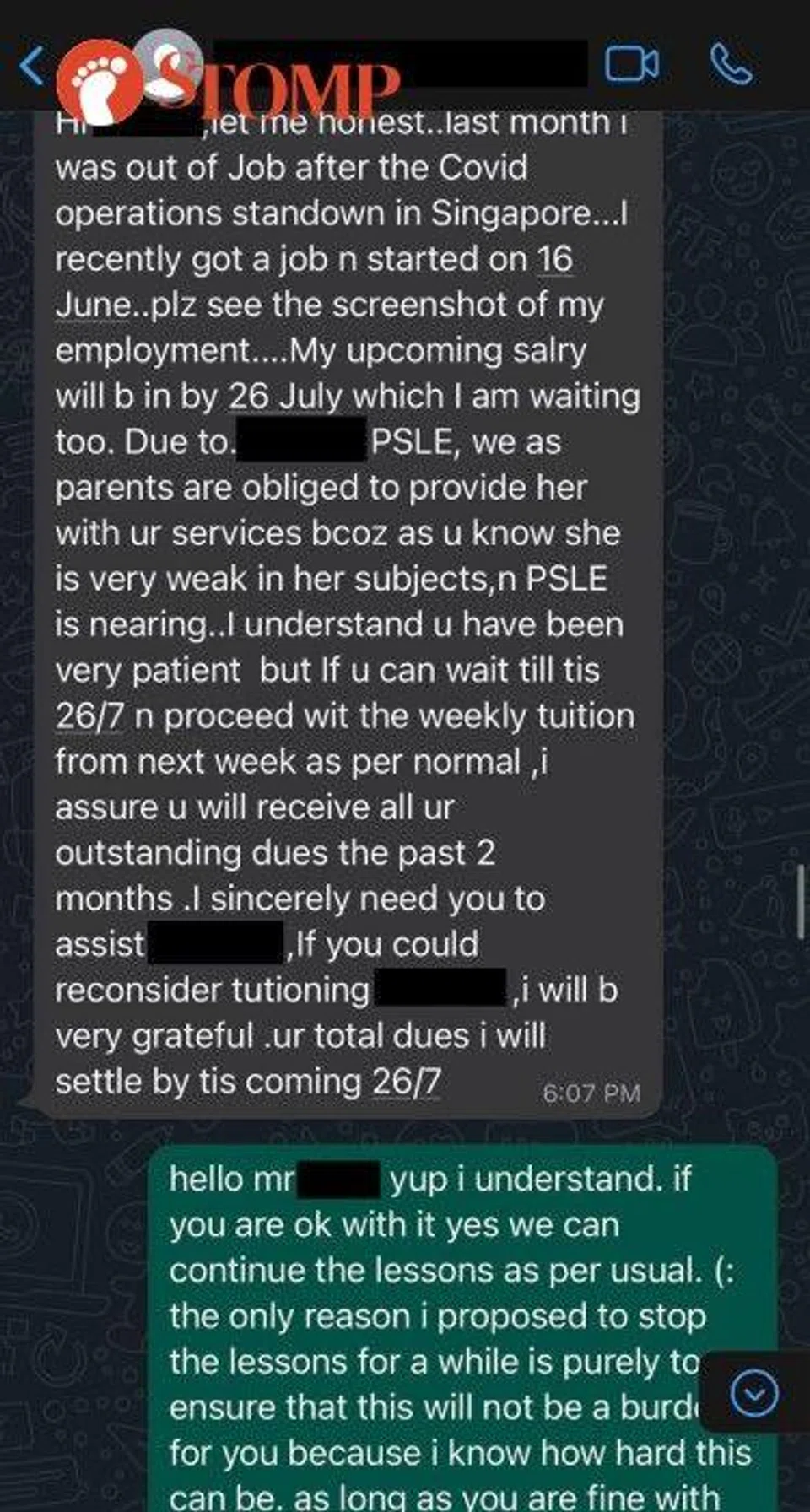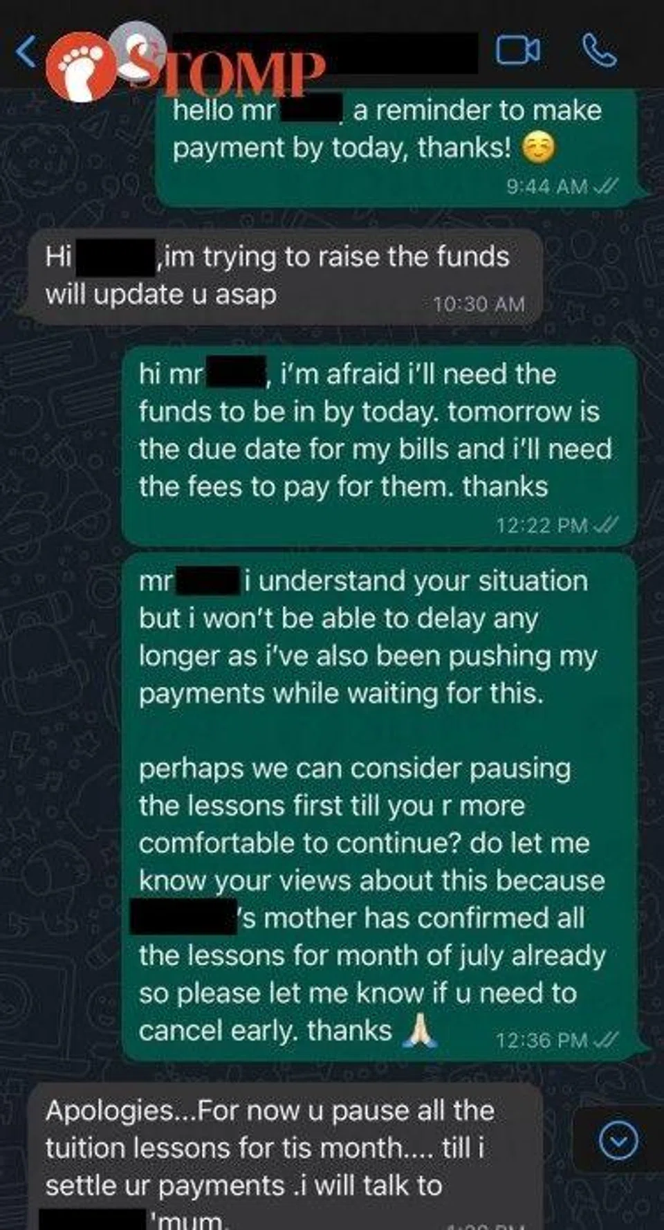 "I told them that if the tuition is giving their family financial stress they can stop temporarily or permanently but the father asked if I could let him pay me on the 26th of each month instead of the usual 7th.