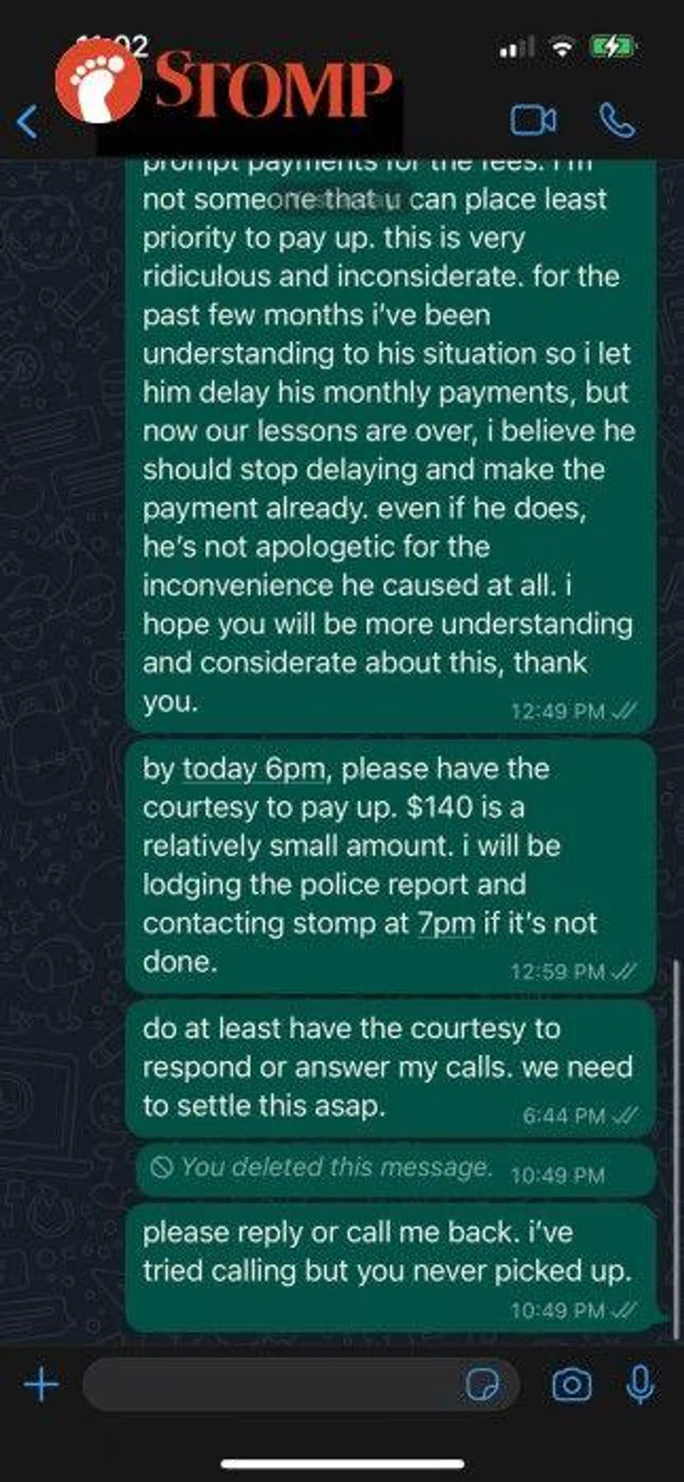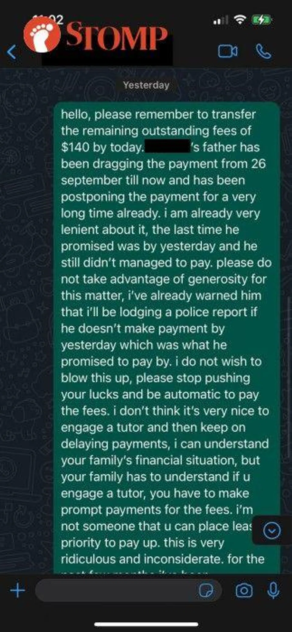 The parents of a Primary 6 student have allegedly been dragging out paying a tutor they engaged to teach their daughter and to date, still owe her $140.