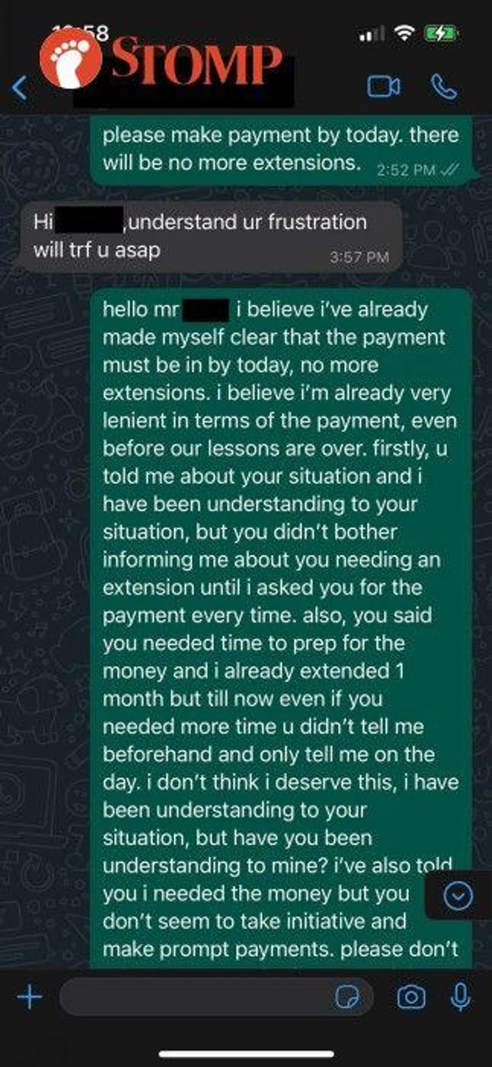 "I understood their situation, but they don't seem to care about the tutors they engaged and don't pay.