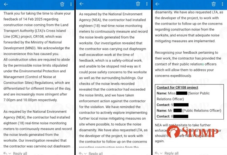"We have also requested LTA, as the developer of the project, to work with the contractor to follow up on the concerns regarding construction noise from the worksite, and ensure that adequate noise mitigating measures are implemented," added NEA.