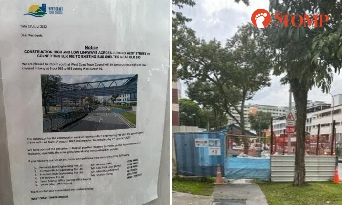 The construction of a covered linkway across Jurong West Street 91 started on Aug 1 last year and was expected to be completed by the third quarter of this year.