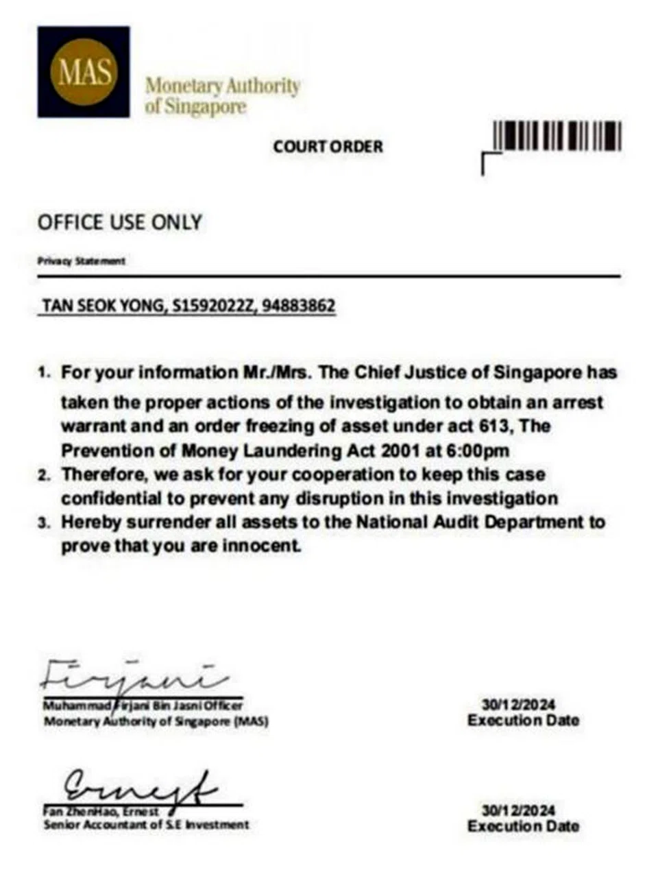 The scammer would send screenshots of court orders purportedly from MAS through WhatsApp to convince the victims to transfer them the money.