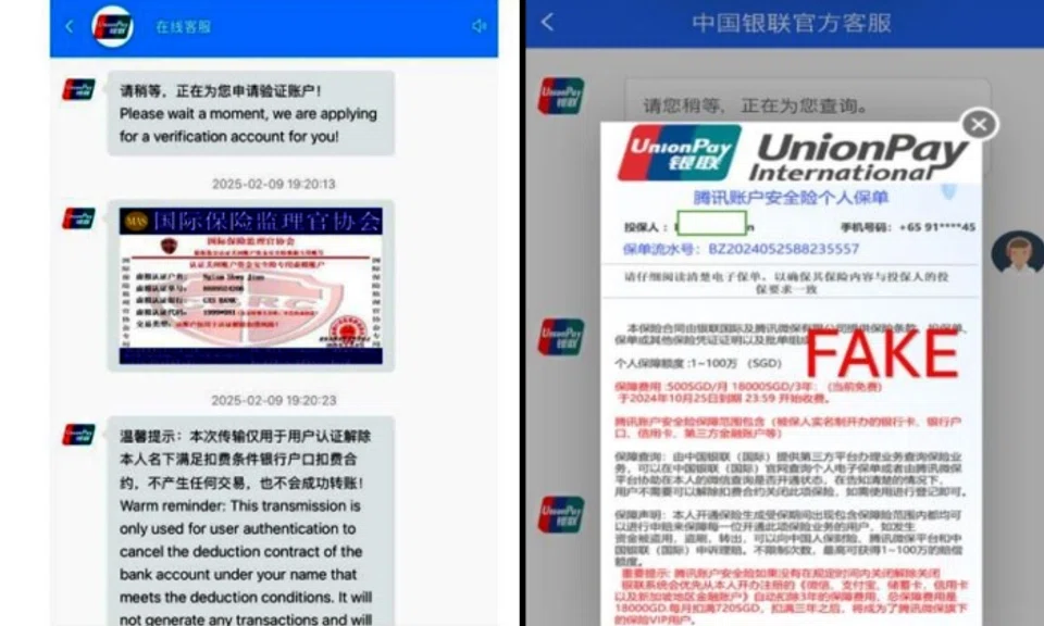 They were redirected to a second scammer purporting to be a UnionPay service representative, who would request personal information from the victims, such as bank account details and personal credentials, to verify their policy details.
