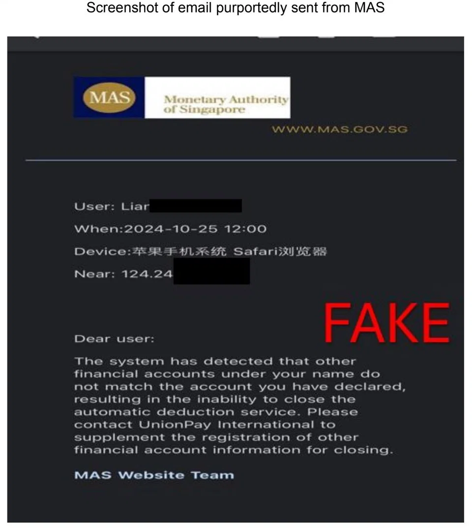 - Sending email purportedly from the Monetary Authority of Singapore (MAS) that their financial accounts do not match the records maintained by MAS.
