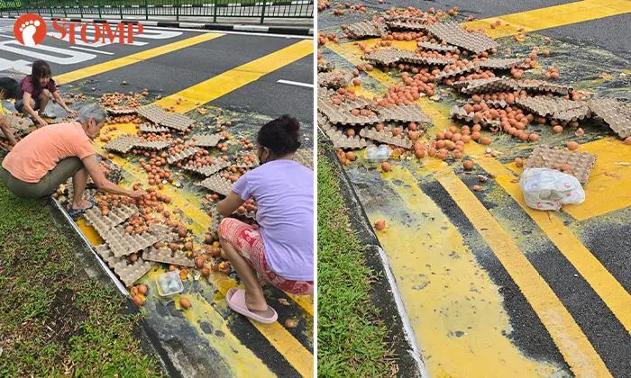 People scrambled to pick up eggs that were spilled on the side of a road along Corporation Drive in Jurong West.