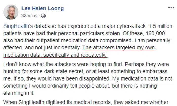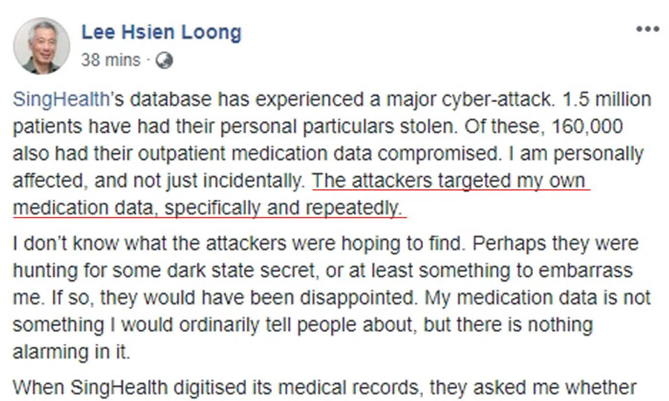 PM Lee said in a Facebook post regarding the cyber attack that the attackers targeted his own medication data "specifically and repeatedly".