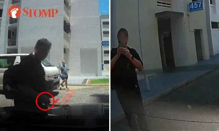 A private-hire vehicle driver called out a pedestrian who "hit" her car for blocking his way and allegedly threatened to call the police.