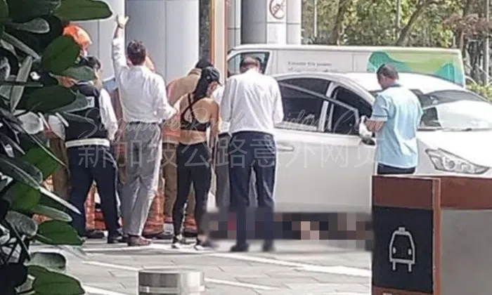 Photos shared in the Facebook group Singapore Roads Accident show a white car at the pick-up area, with a man in black shorts lying on the ground. Several bystanders are seen trying to render help.