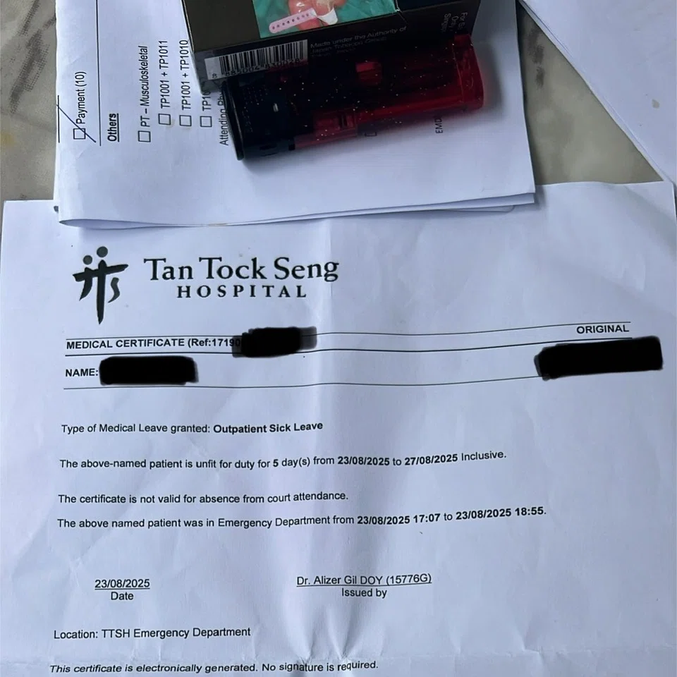 He also shared a photo of a medical certificate from Tan Tock Seng Hospital granting him sick leave from Aug 23 to 27. The document states that he was in the emergency department on the day of the incident from 5.07pm to 6.55pm.