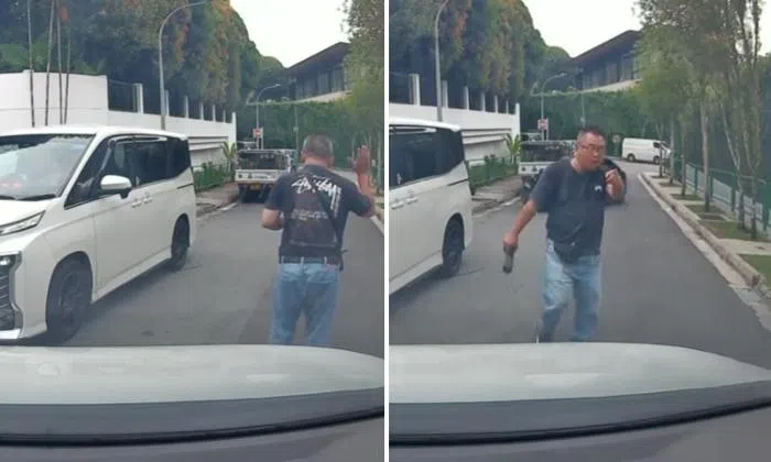 The video shows a bespectacled man standing in the middle of a narrow road in front of the cam car. He appeared to be the driver of a white Toyota Voxy parked nearby on the side of the road and holding a flask.