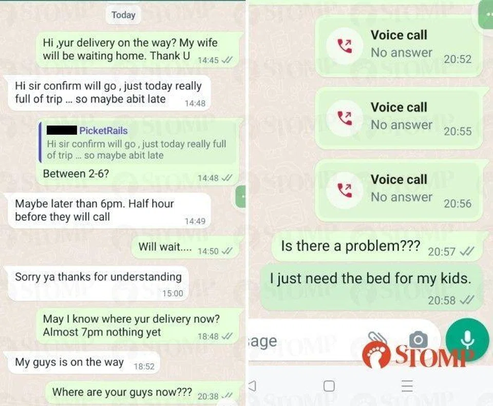 On Dec 19, Elvin told Stomp: "They were supposed to deliver a loan bed to me today, but I waited for the delivery from 2pm to 6pm and then to 9pm but also no show. Now the salesperson didn't want to answer my calls or my WhatsApp messages."