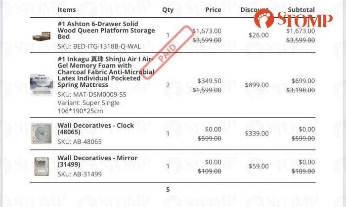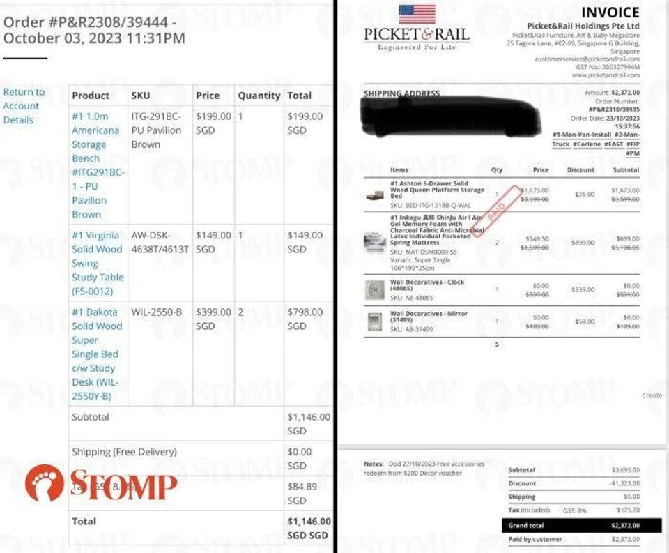 Stomper Linda shared copies of two invoices, one of which shows she paid a total of $1,146 for a storage bench, a study table and a bed with a study desk on Oct 3.