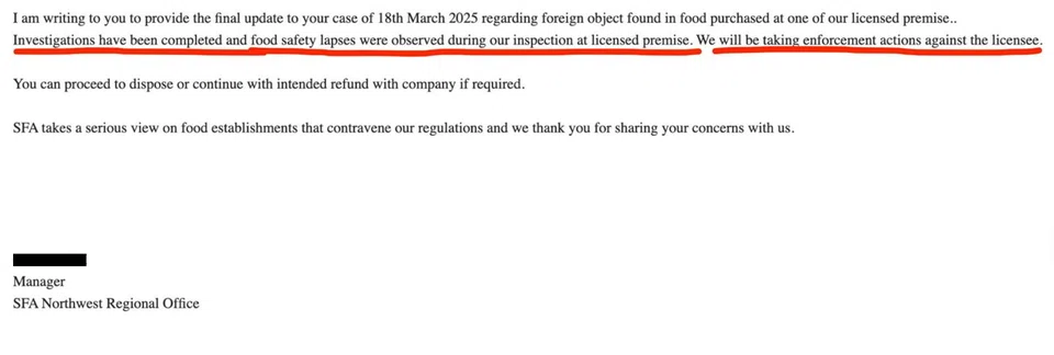 The email said: "Investigations have been completed and food safety lapses were observed during our inspection at licensed premise. We will be taking enforcement actions against the licensee.