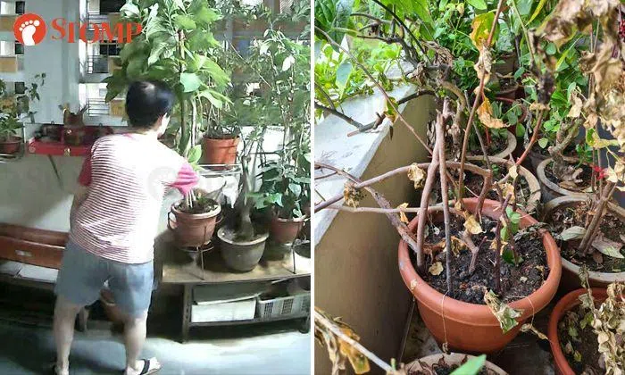 A woman was caught on camera pouring an unknown substance into a family's potted plants along the corridor at Petir Road, Bukit Panjang.
