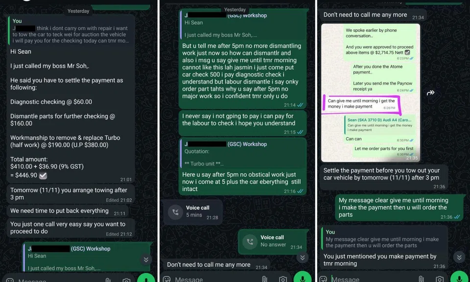 "J then said she would check with her boss, Mr Soh, and subsequently texted that I owed $60 for diagnostic check, $160 for dismantling, $190 for 'halfway work' to remove and replace the turbo."