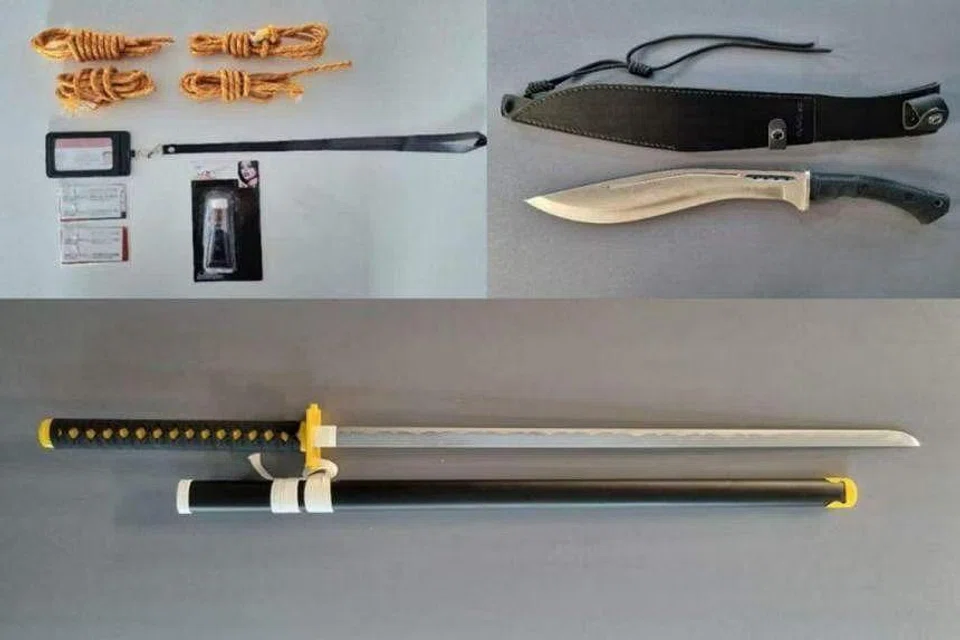 Case exhibits such as the kukri and ropes used in the video were seized.