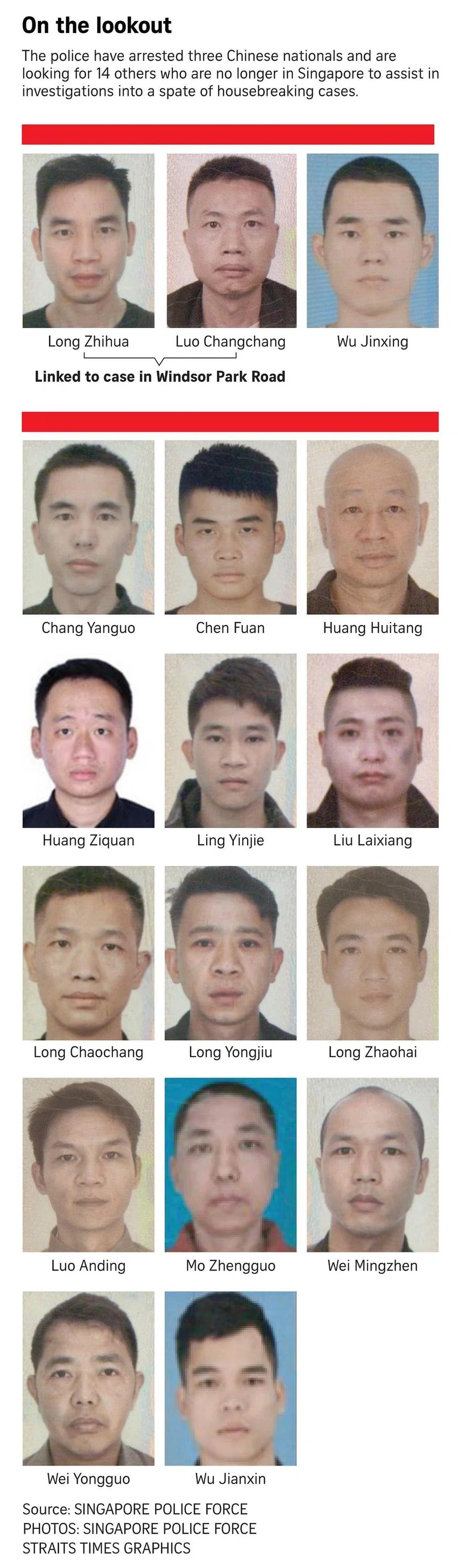 Police on Aug 17 also named the 14 Chinese nationals who they said could assist them in their investigations into the housebreaking cases. They are Wu Jianxin, Huang Ziquan, Chang Yanguo, Wei Yongguo, Long Zhaohai, Luo Anding, Mo Zhengguo, Ling Yingjie, Chen Fuan, Long Yongjiu, Long Chaochang, Wei Mingzhen, Huang Huitang and Liu Laixiang.