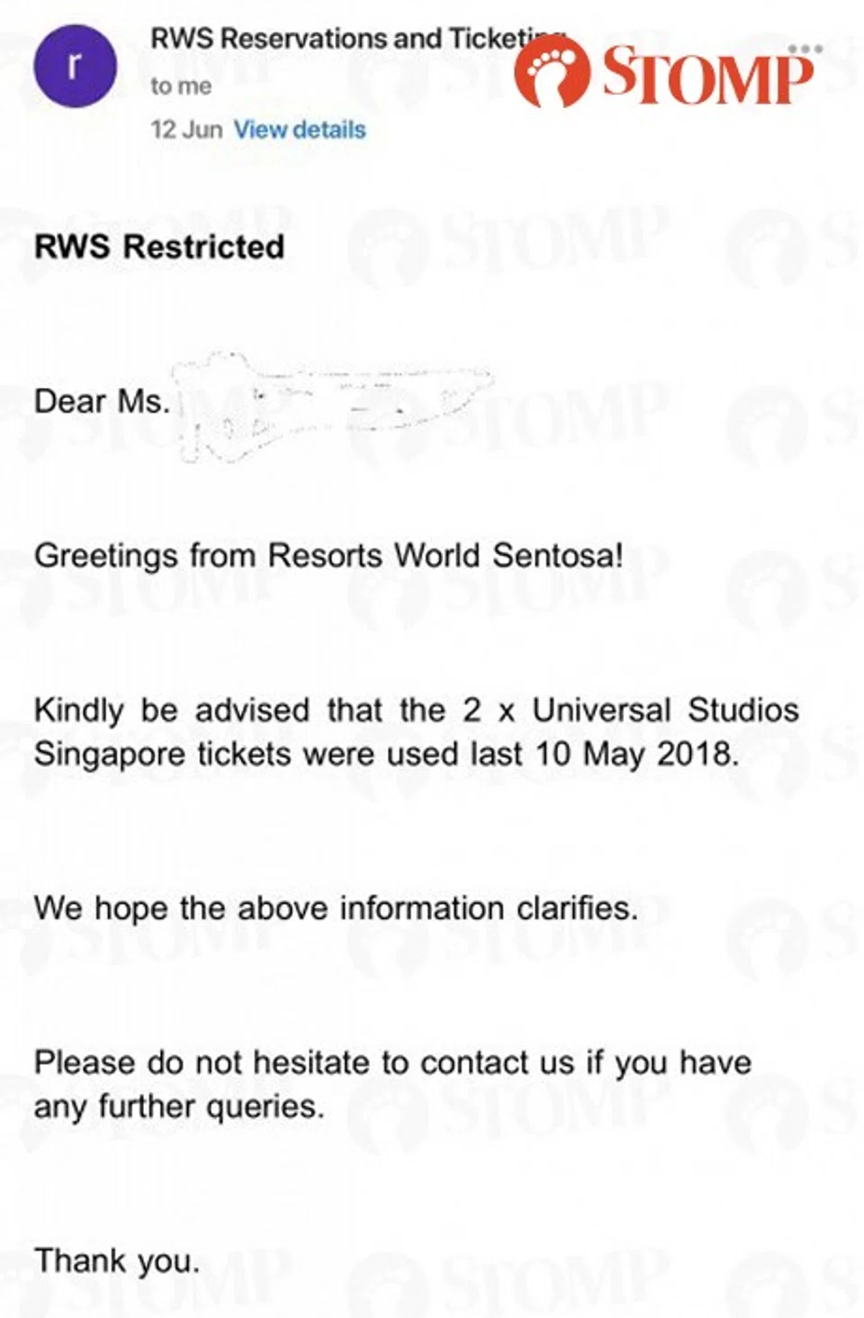 At about 7.45pm on the same day, Shana received a response from USS, informing her that the two e-tickets were invalid and had already been used on May 12.