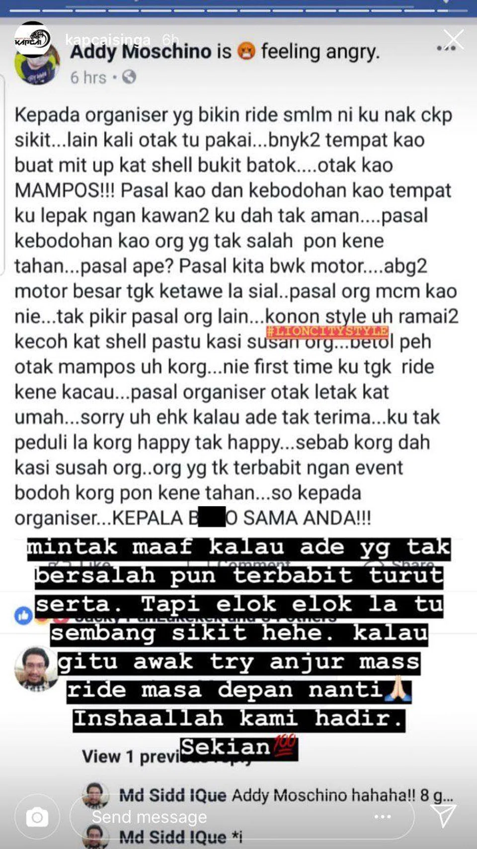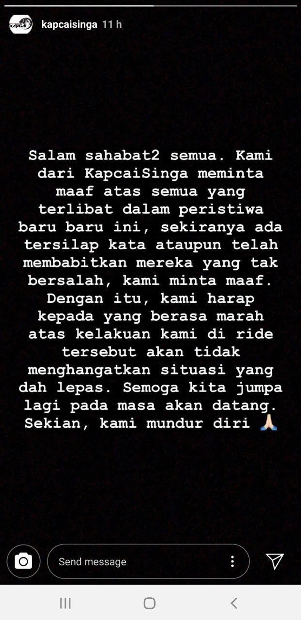 Translation: Greetings to all our friends. "We from KapchaiSinga would like to humbly apologise to all parties, both directly and indirectly, affected by the recent event. With this, we truly hope that everyone can put to rest all talk of the incident. May we meet again in the future, but until then we at KapchaiSinga are taking a step back to reflect on this situation."