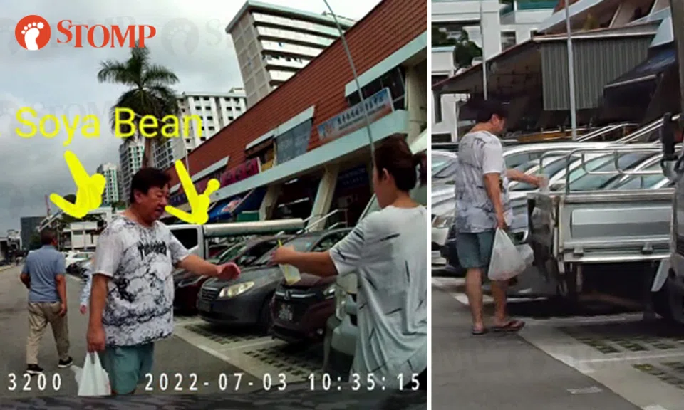 In the video, a woman can be seen passing a cup containing remnants of soya bean milk to the man as they walk along the carpark.