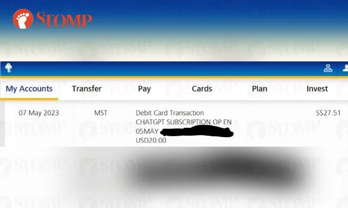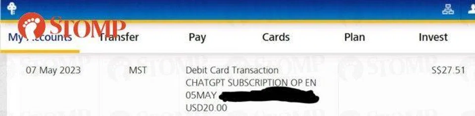 Stomper YP said: "I was checking my POSB debit card transaction and found a suspicious transaction of US$20 for a 'ChatPT subscription'.