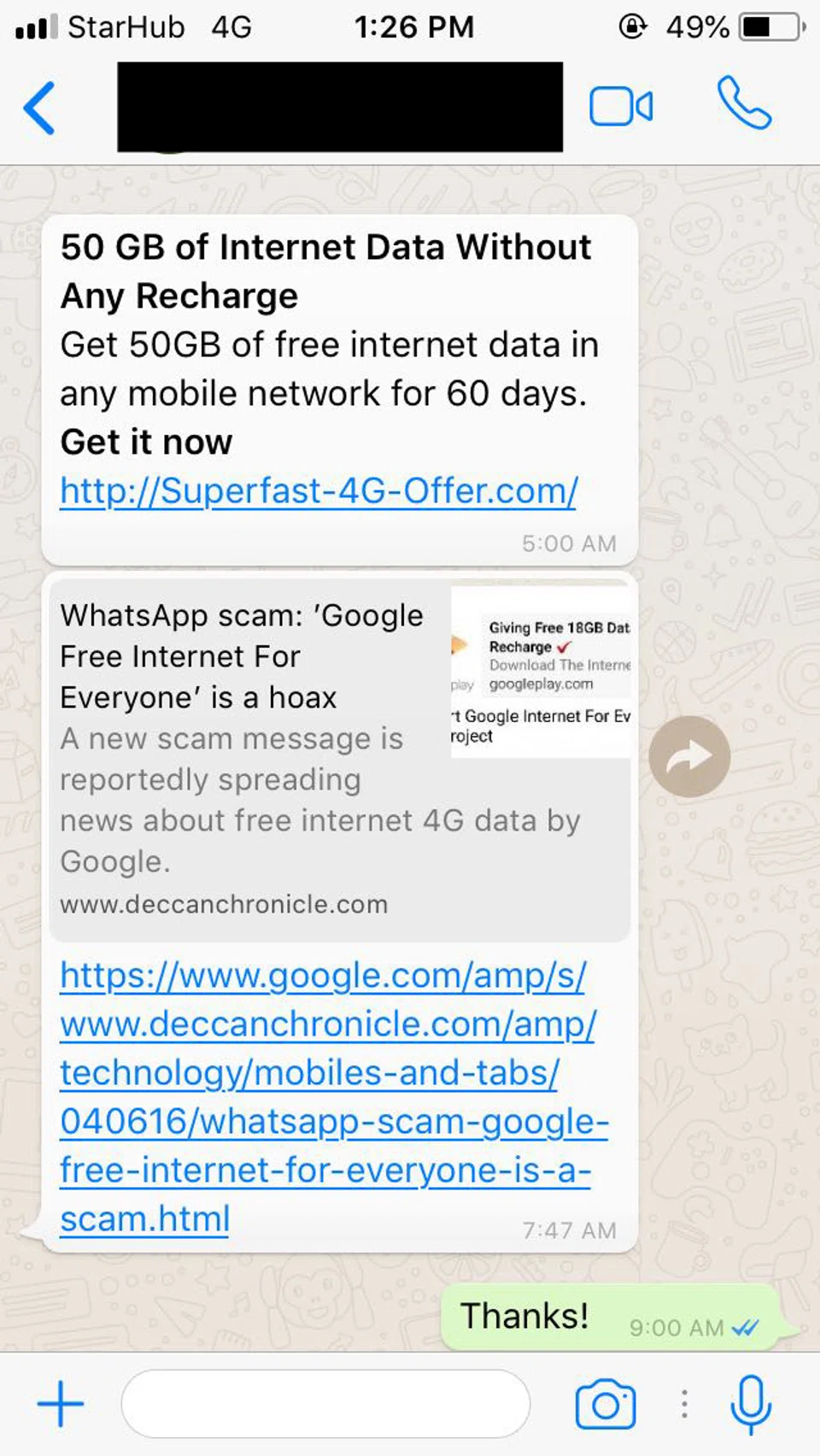 A Stomper had alerted Stomp to a hoax that was circulating on WhatsApp, informing people that they will get 18GB of free 4G Internet data from their service providers.