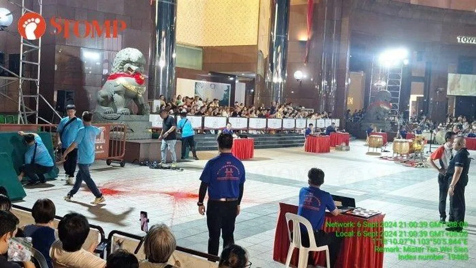 Red paint balls thrown near judge's table at lion dance competition outside Ngee Ann City