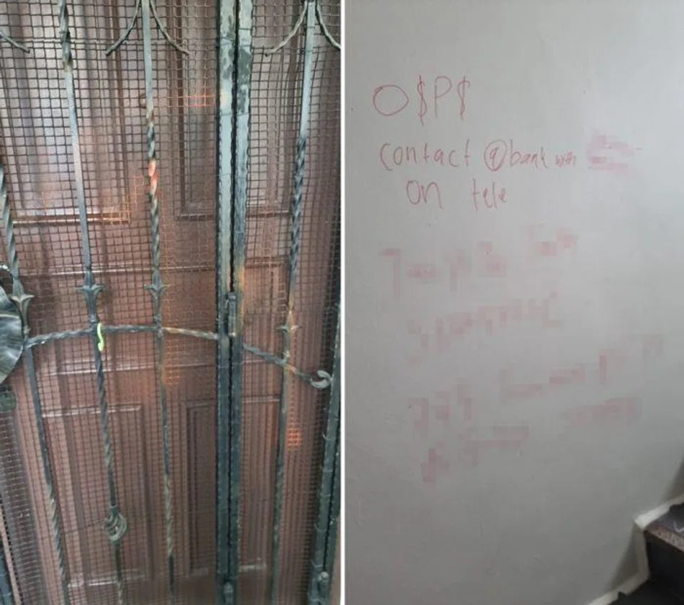 The walls at the staircase near the unit were scribbled with loanshark-related graffiti.