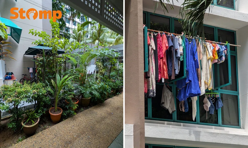 W also took issue with inconsiderate behaviour by other residents of the block: "Look at the unsecure way of hanging clothes. The banana trees are also blocking drivers and other residents walking to the bus stop."