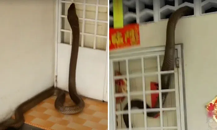In the clip, the king cobra, estimated to be eight feet long, can be first seen moving among some boxes and shelves outside the house. It then slithered up the door and its metal grills.