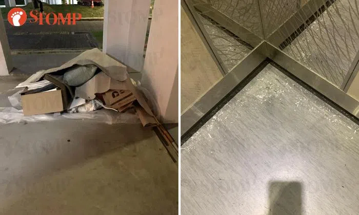 Francis shared photos showing materials such as cardboard left at the void deck, as well as dust around the lift area.