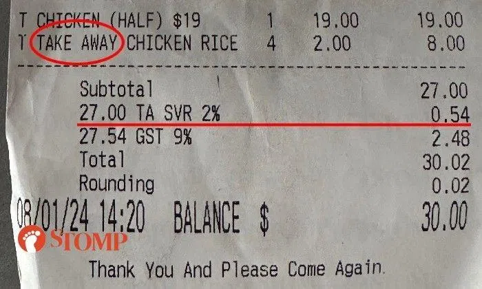 "There was no service charge imposed on my takeaway before the restaurant was renovated and I have not seen other F&B establishments charging service charge for takeaway," said the Stomper.