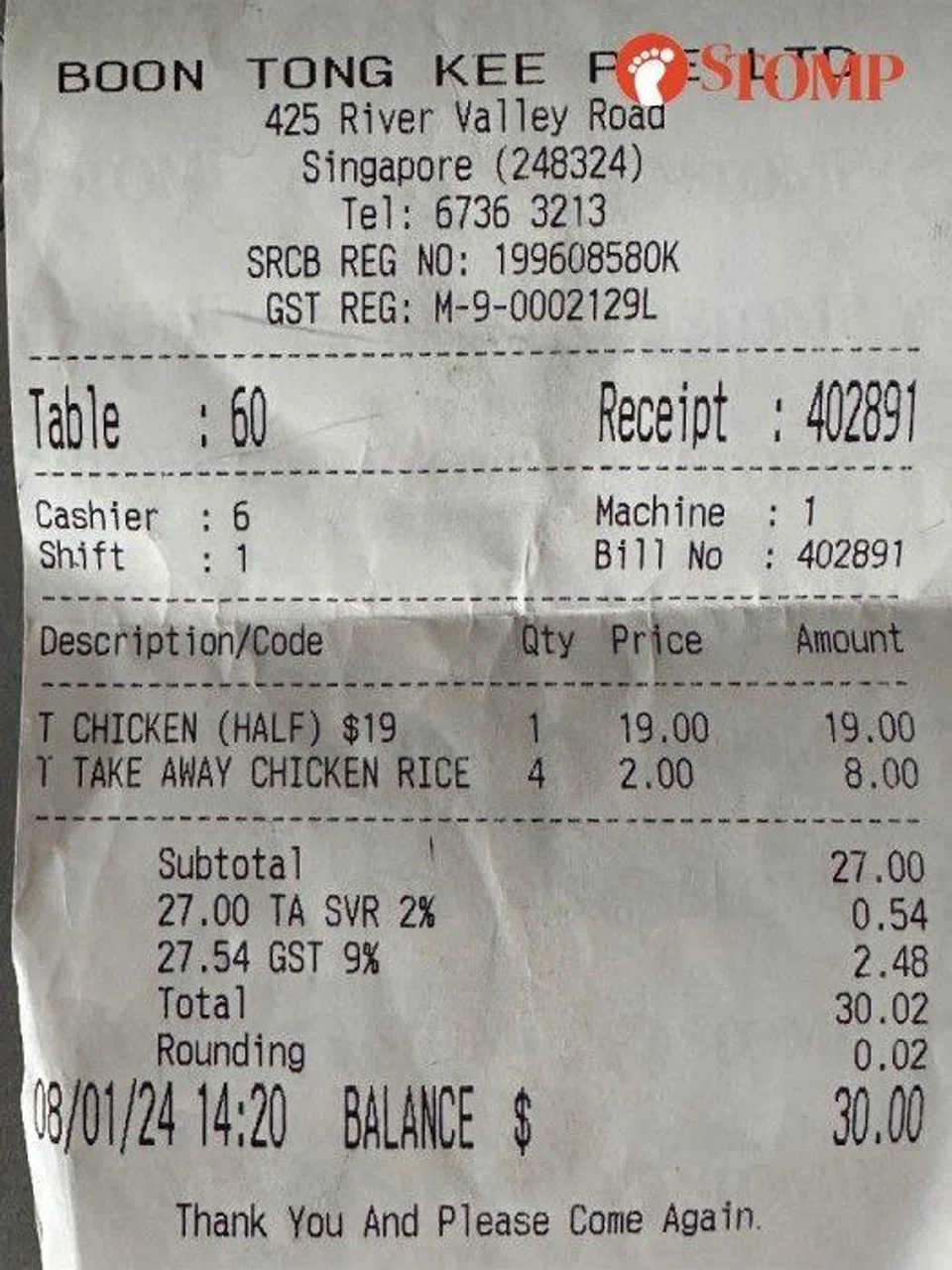Stomper Alvin had gone to the newly renovated Boon Tong Kee outlet in River Valley to order food for takeaway on Jan 8.
