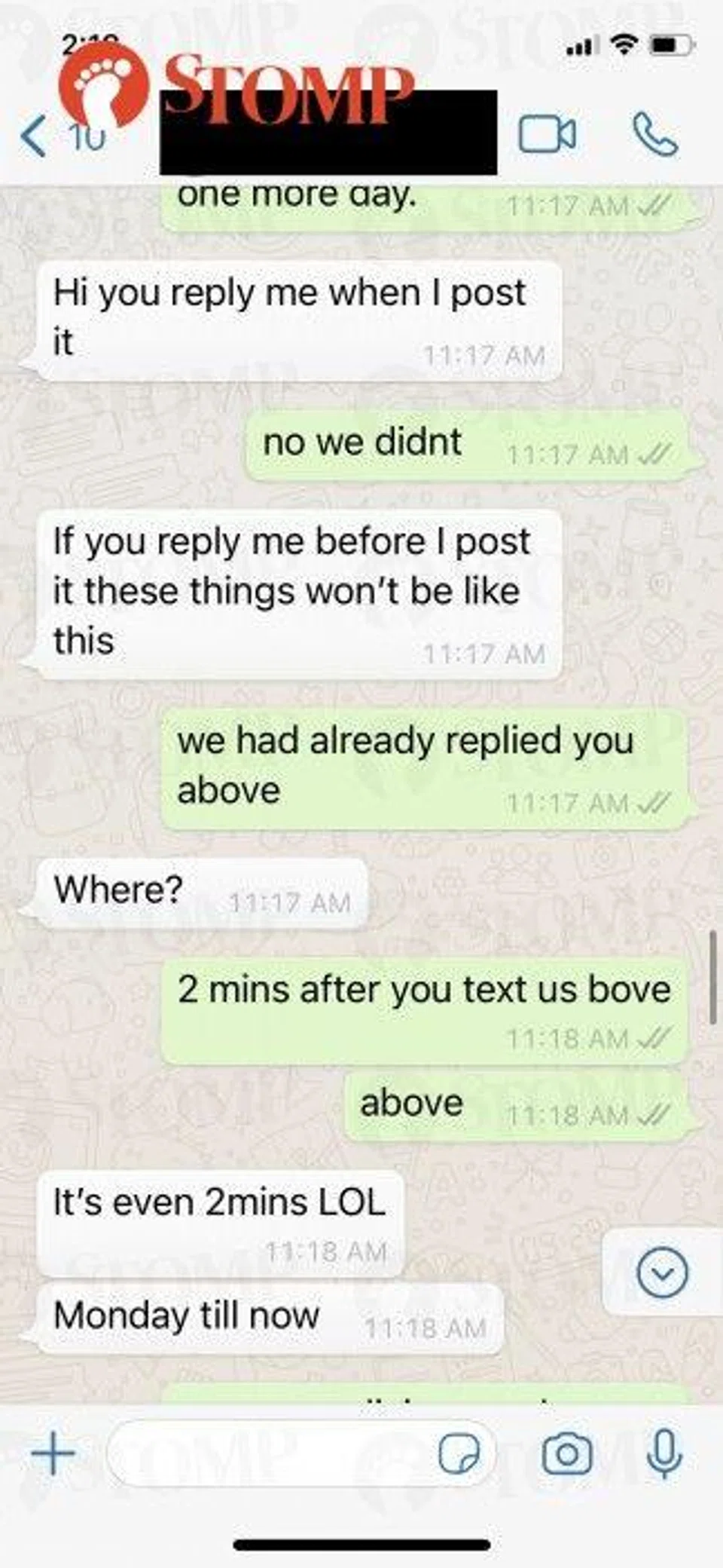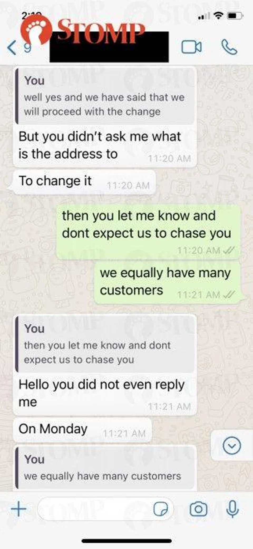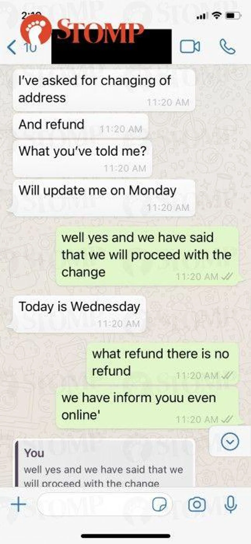 Attached as evidence, the WhatsApp correspondences between our admin team and the customer. Unfortunately, the call we had was not recorded.