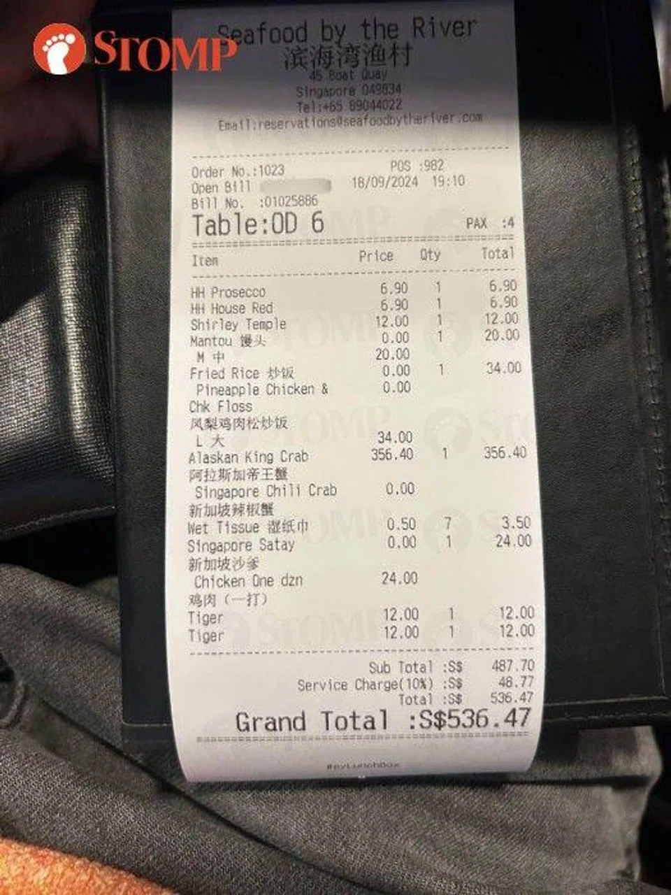 Stomper Sherry shared a photo of the receipt, where the priciest item is the Alaskan king crab, costing $356.40.