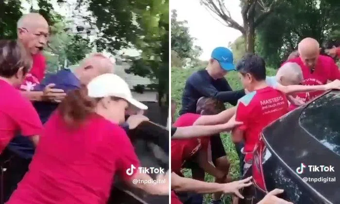 Retirees help elderly driver and passenger out of Hyundai in 4-car accident at Bishan-AMK Park