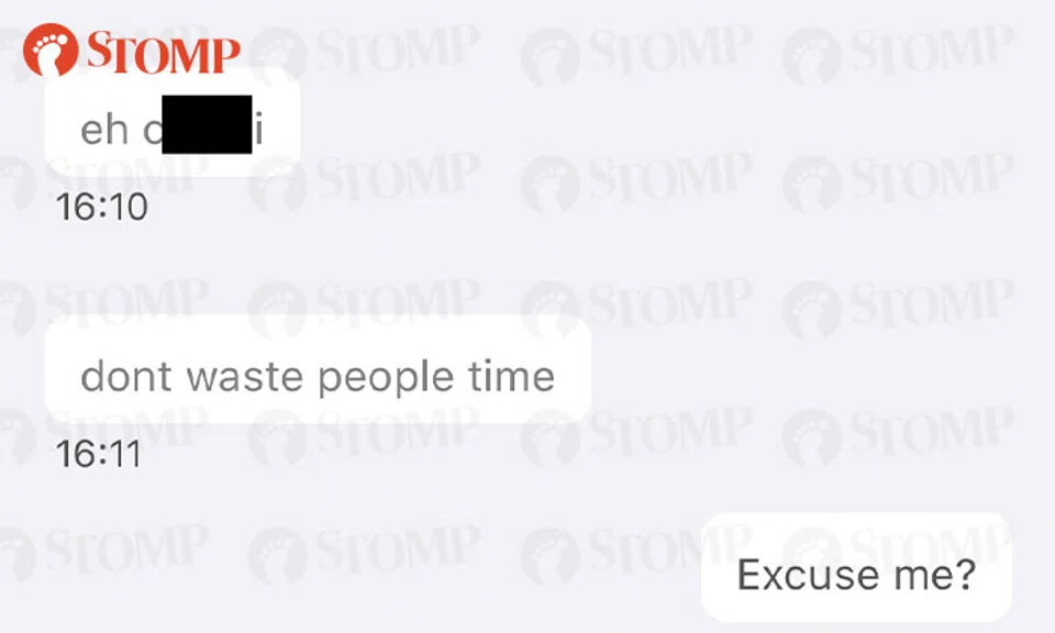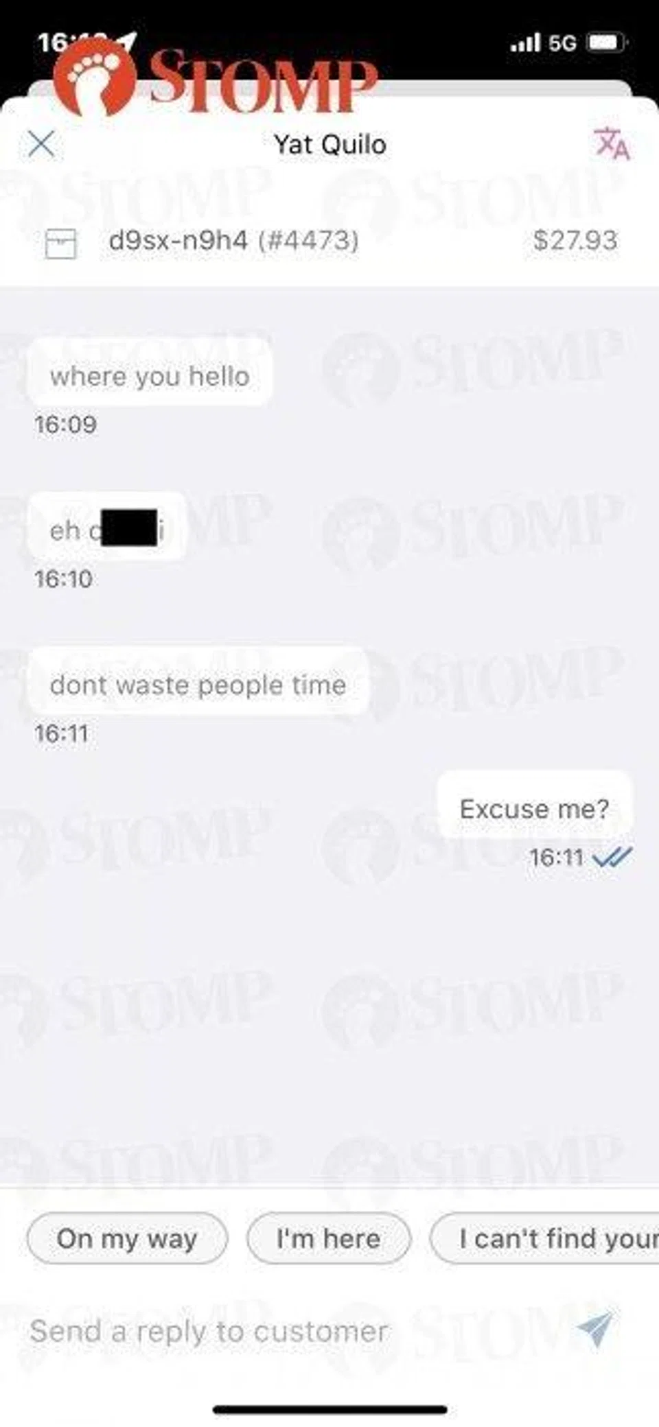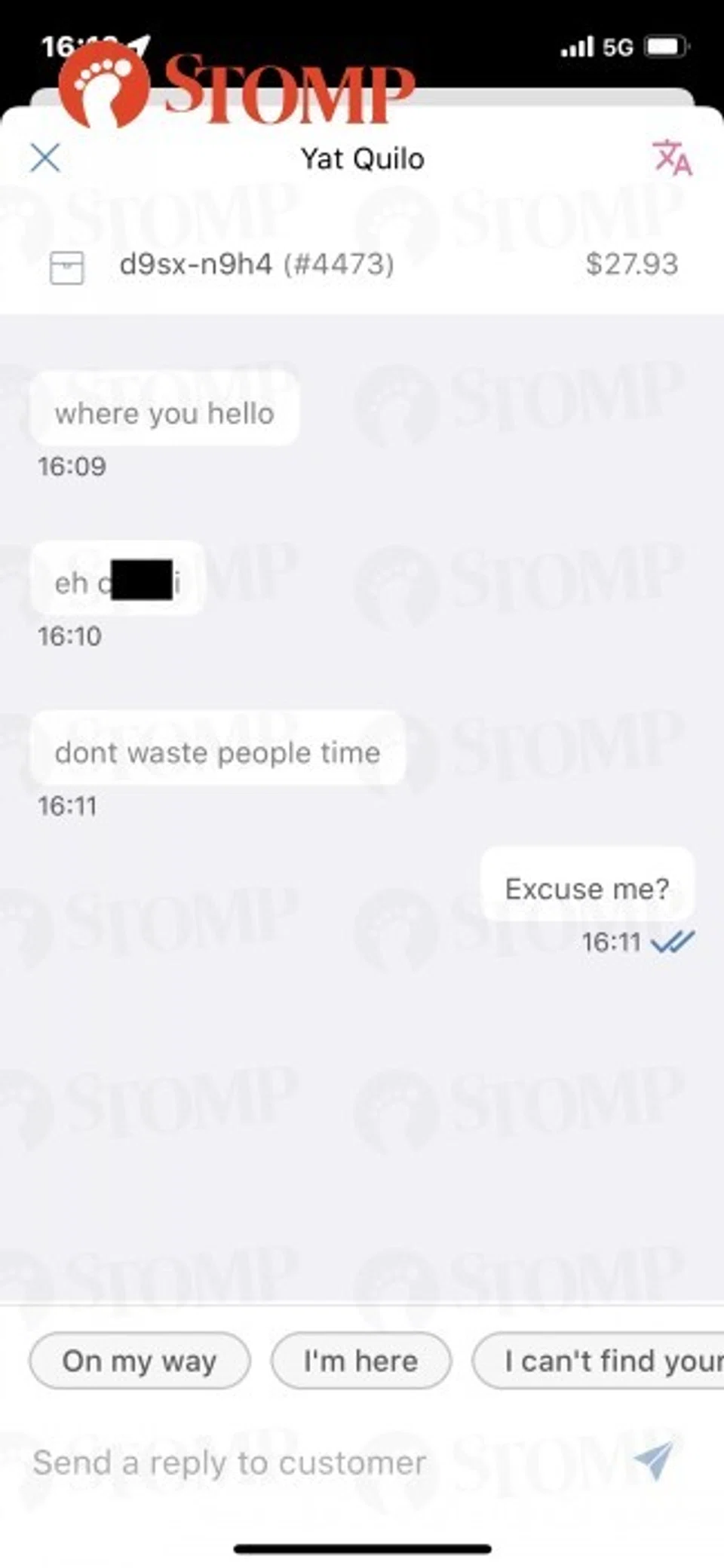 He shared with Stomp the texts he received from the customer, demanding to know his location and telling him not to "waste people['s] time".