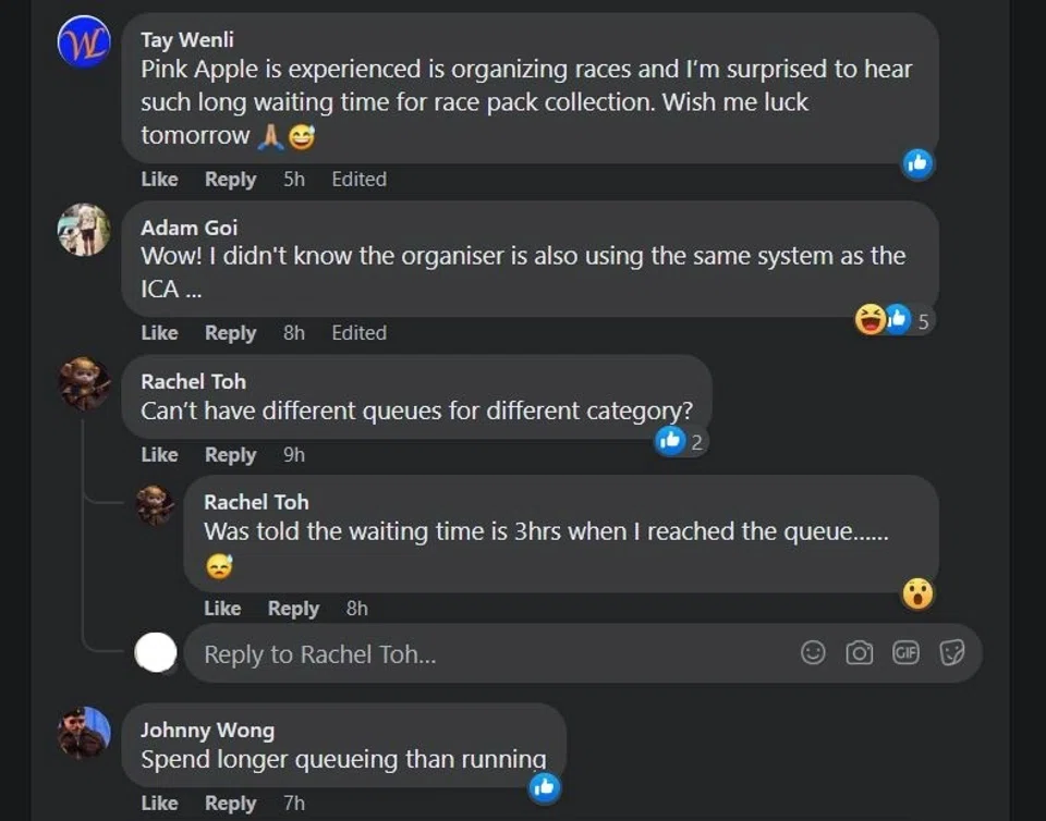 Another quipped: "Wow! I didn't know the organiser is also using the same system as the ICA (Immigration and Checkpoints Authority)."